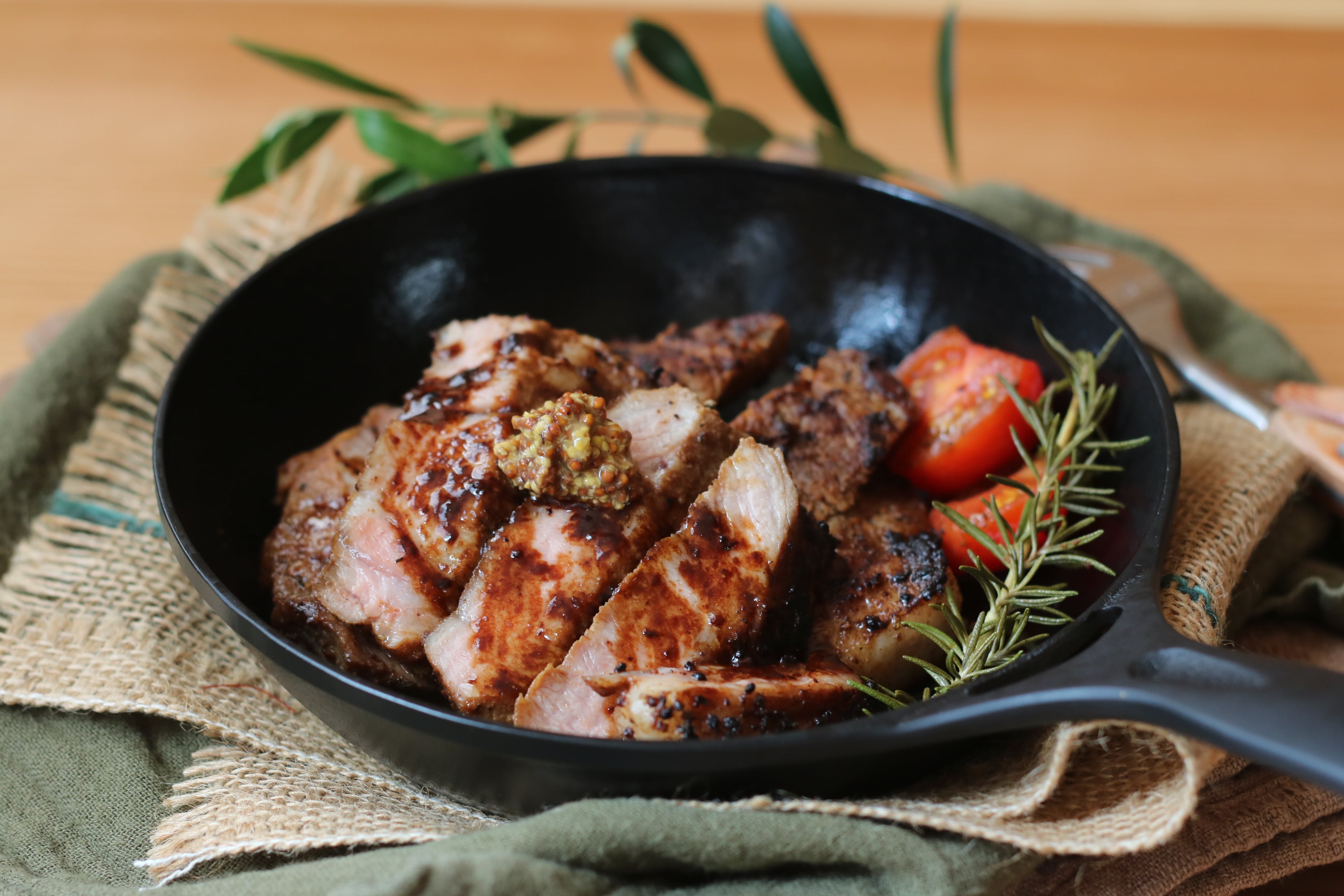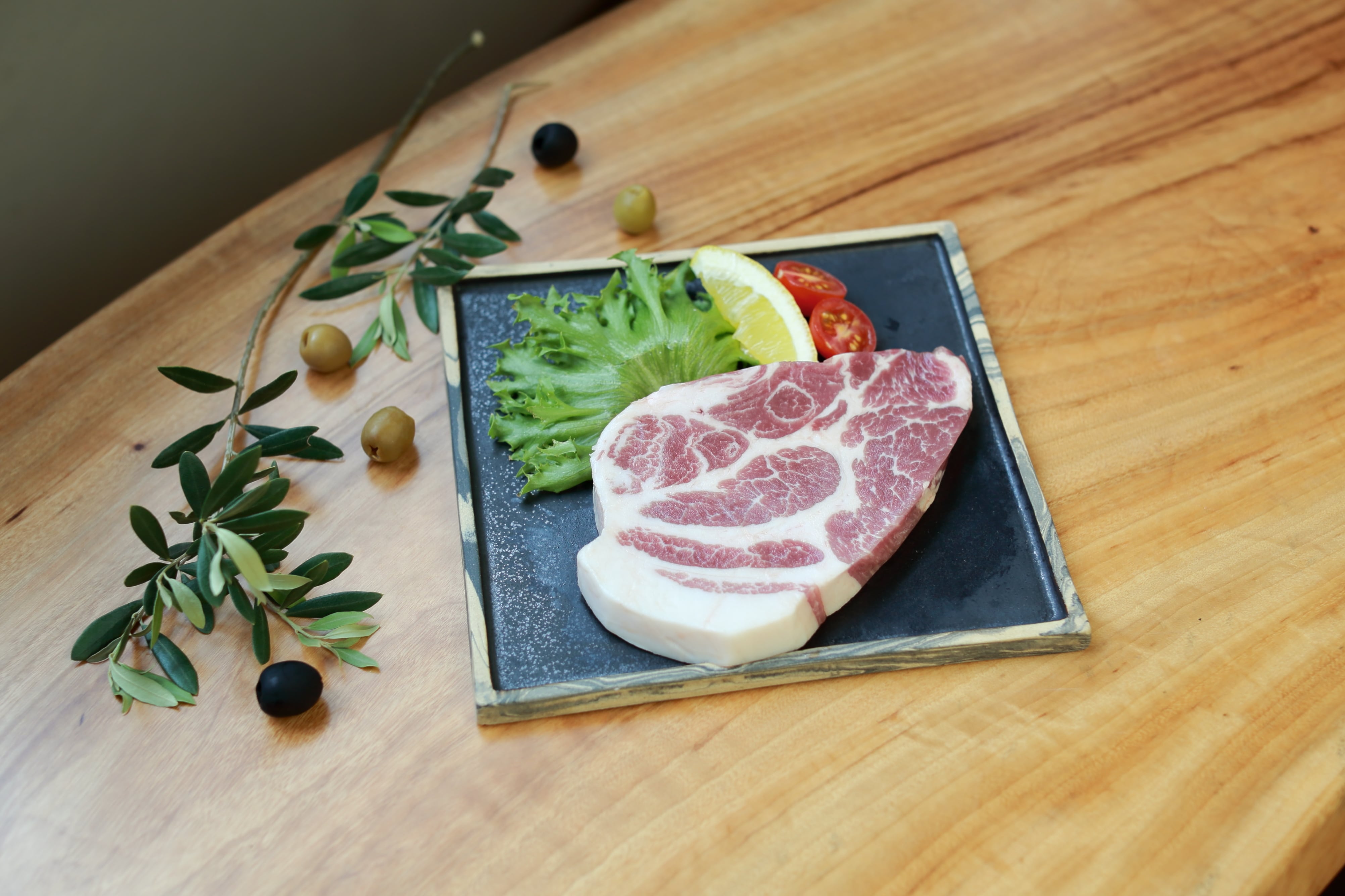 自社オリーブ農園、自社農園で大切に肥育した希少で高級な赤豚「霧島オリーブレッドポーク」を使用しております。赤身の中に程よい脂身を含み、そのまま焼いてステーキとして味わうと絶品です